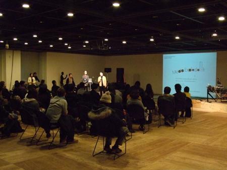 1/20(日)に行われたICC Media Explosion。13時に始まり途中小休憩を入れながらも、21時まで様々な熱いプレゼンテーションが繰り広げられました。「これはアートか?」と議論が白熱する場面もしばしば。そんな中、asanoLabからも間宮麻未と佐藤真理子がそれぞれのインタラクティブ作品最新作を会場に持ち込みプレゼンテーションを行いました。サウンド系のパフォーマンスが多い中、異色のプレゼンテーションとなりましたが様々な反響があり、休憩時間にも作品を体験する人との間にディスカッションが生まれ、非常に良い交流の場となっていました。